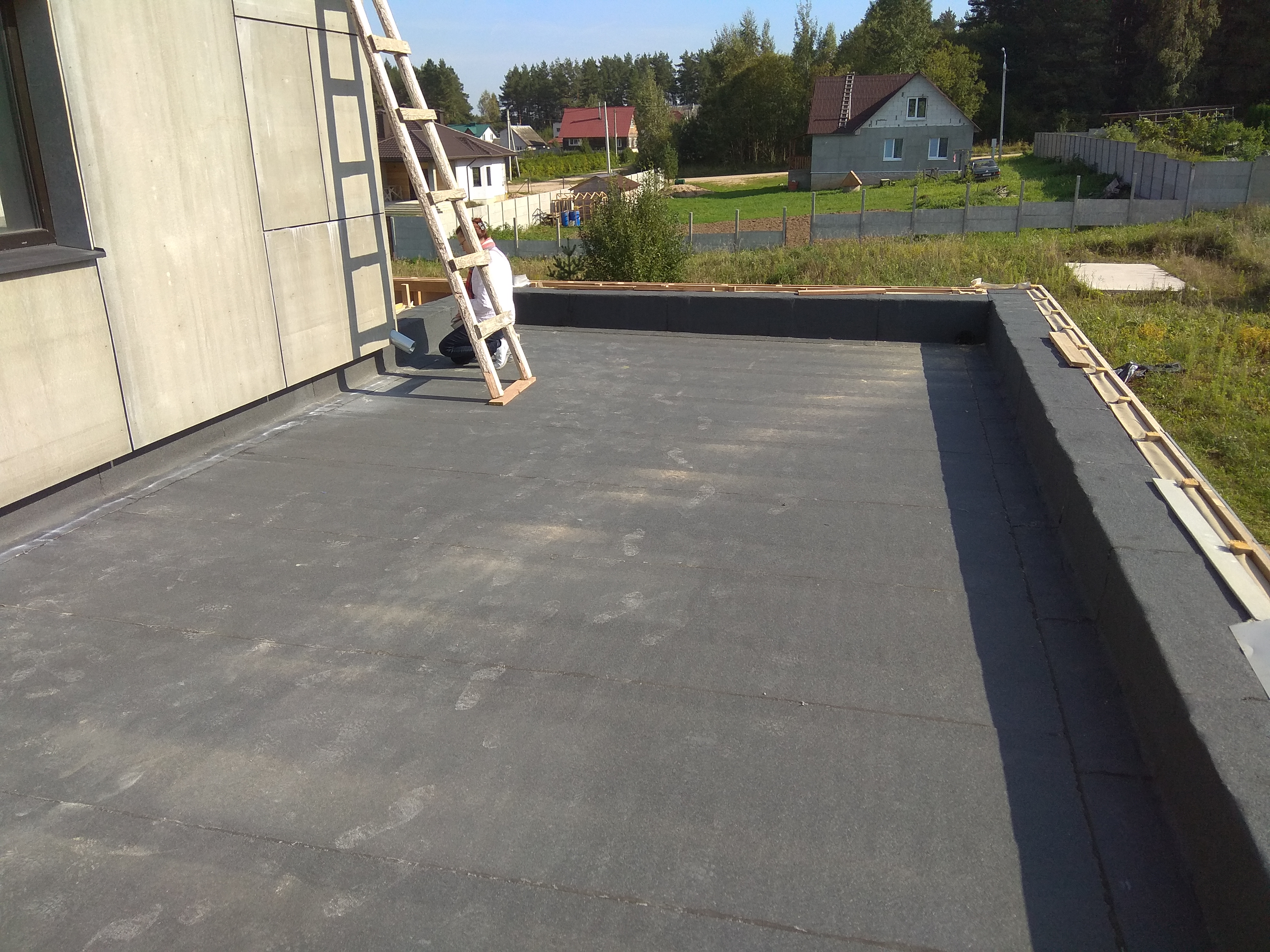 ерновая отделка. А мне ещё до такого состояния далеко, я только к кровле подошёл. Кровля покрыта гидроизоляцией «Технониколь», хотя ранее я грезил надеждой покрыть ПВХ мембраной, но стоимость за ПВХ мембрану и за работу просто неадекватна. Я, кстати, себе хочу закатать только верхний слой и сделать просто более качественно, и сделать разуклонку всё же в две стороны, хотя здесь выполнено в одну и вроде как всё нормально.